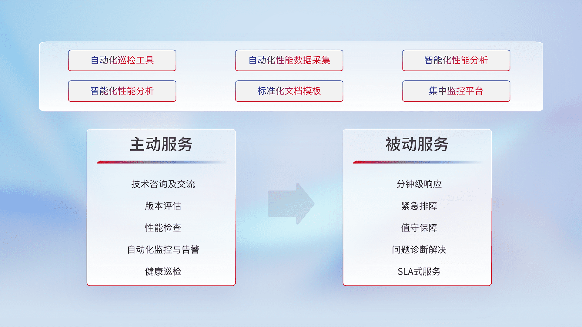 智能化工具和标准化文档,,保障服务质量,,提供主动服务(包含技术咨询、、、、版本评估、、、性能检查、、、自动化监控与告警、、健康巡检)和被动服务包含(分钟级响应、、紧急排障、、、、值守保障、、问题诊断解决、、、SLA服务)。。。